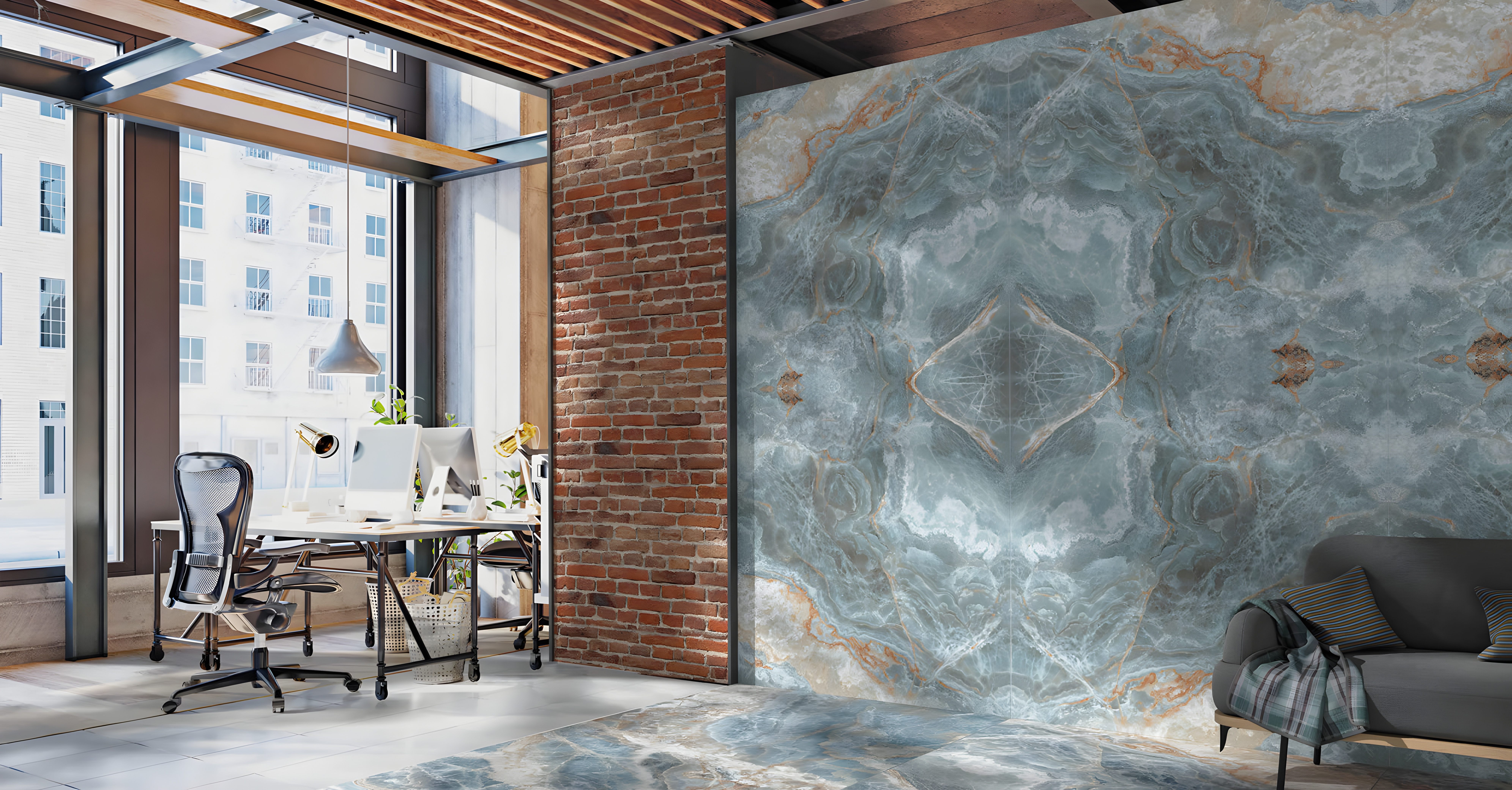 Make a fearless statement with Osso, a porcelain masterpiece that captures the raw, ethereal beauty of exotic Blue Onyx. This tile features a dramatic interplay of colors, dominated by a deep, translucent turquoise and cool seafoam background that mimics the depth of tropical waters.4