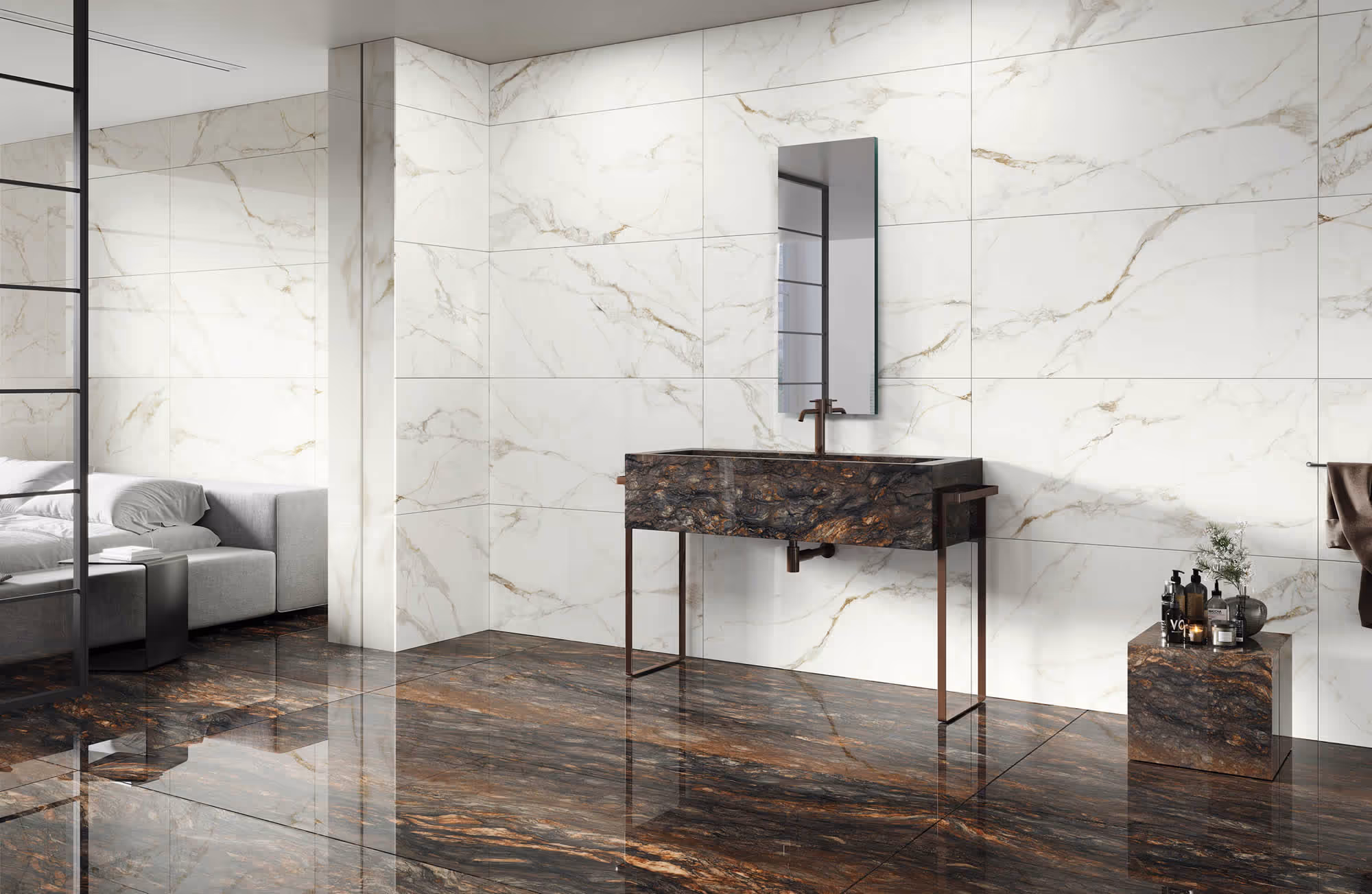 Valeria Rectified Polish tile offers precise, clean edges for seamless grout lines and a polished and matte finish that enhances any space with a sophisticated shine.